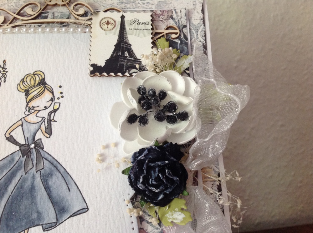 I matted and layered the card with papers by Fabscrap. Added lace and chipboards . I made the White flowers with Foamiran and the dark blue roses from wild orchids.