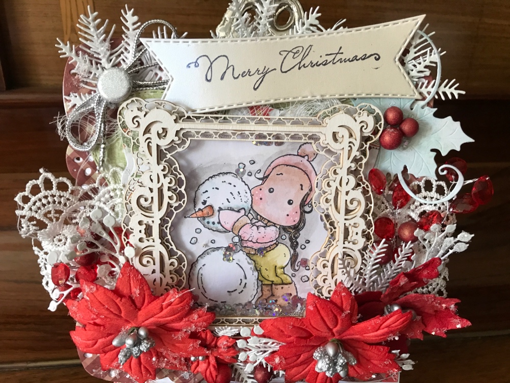 My post today is a star-shaped easel card and Aladdin Tilda with Lamp which I coloured with my Copics and using masking technique I stamped her sitting on a rug. I then die-cut it out with Doohickey Edwin's Rectangle Lace die and tied red with gold sparkles ribbons on the corners.
